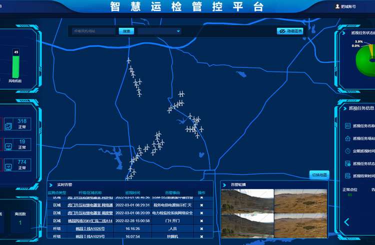 在风电机组、光伏区、升压站和线路各场景中,安装可视化监控装置、运检机器人和各类传感器,采用“机器人+高清视频”的联合运检方式,结合人工智能图像识别技术自动识别设备、人员、环境异常信息,深度融合新能源场站运检规程,搭建统一的智慧运检管控平台,实现24小时不间断智能运检、更快发现现场安全隐患,减轻运维人员巡视压力,提高运维巡视效率,实现场站“无人值守、少人值班、集中监控”。